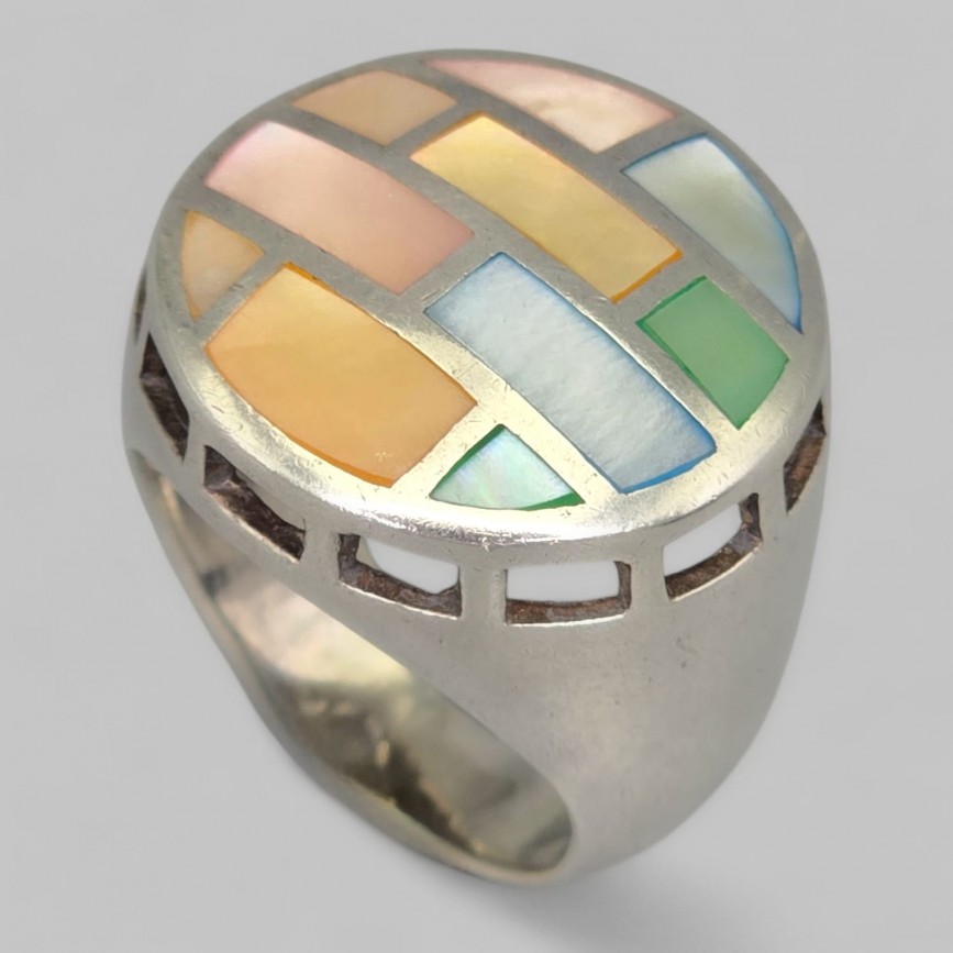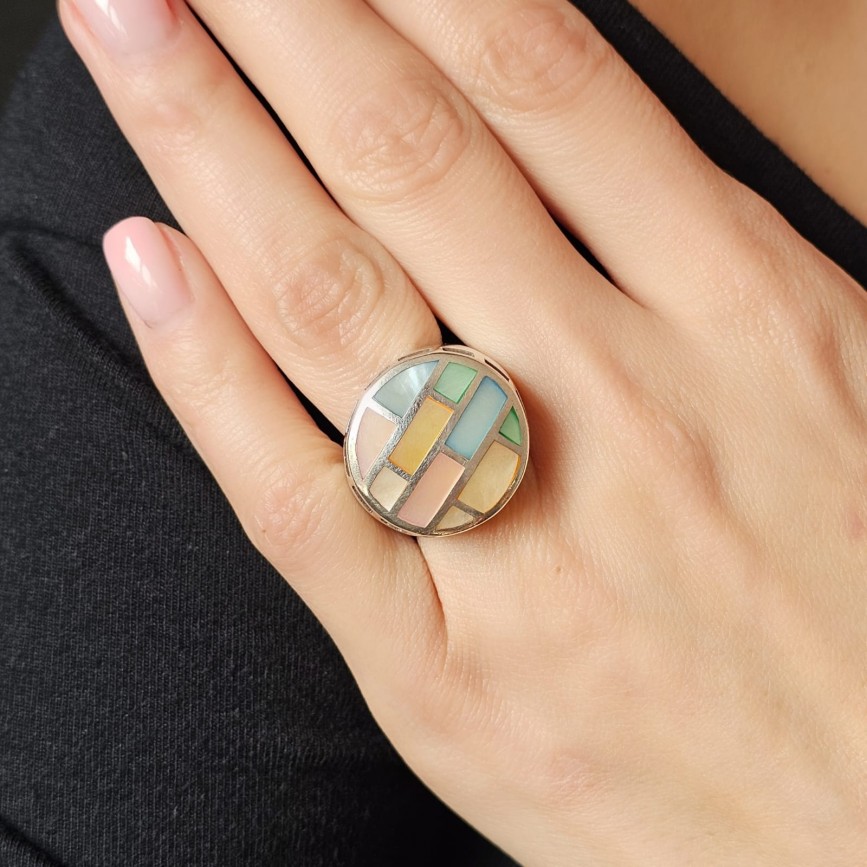 Inel statement din argint cu intarsie de sidefuri naturale.