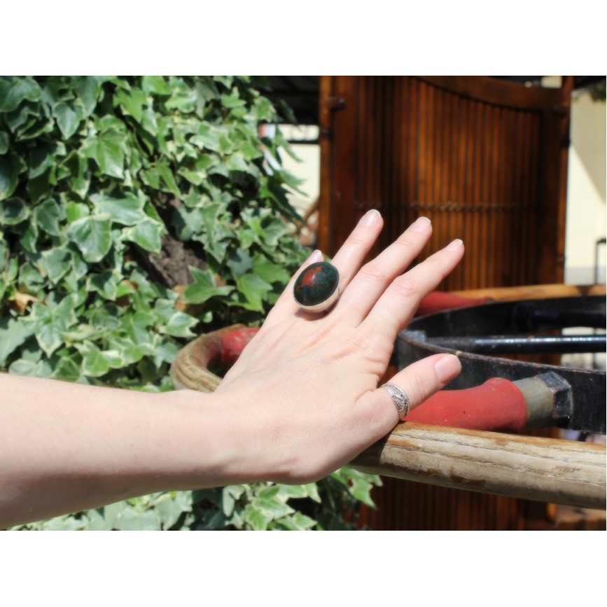 Spectaculos inel statement decorat cu un impresionant anturaj de jasp  "piatra sângelui" ( en. bloodstone ).