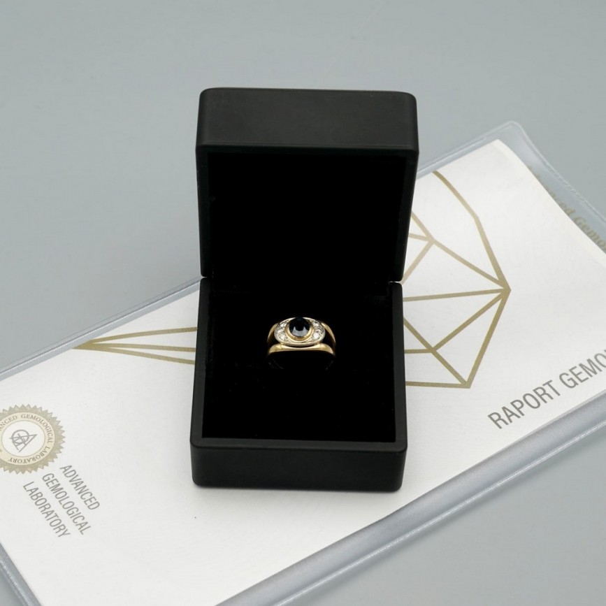 manufactură în aur galben și aur alb 18k, turnat, presat și cizelat; safir natural și diamante naturale certificate pe standard  GIA