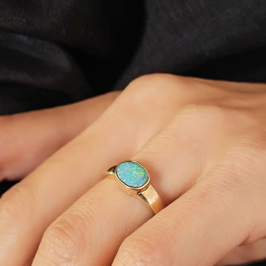 Inel vintage manufacturat în aur galben 14k, decorat central cu anturaj de opal natural boulder australian.