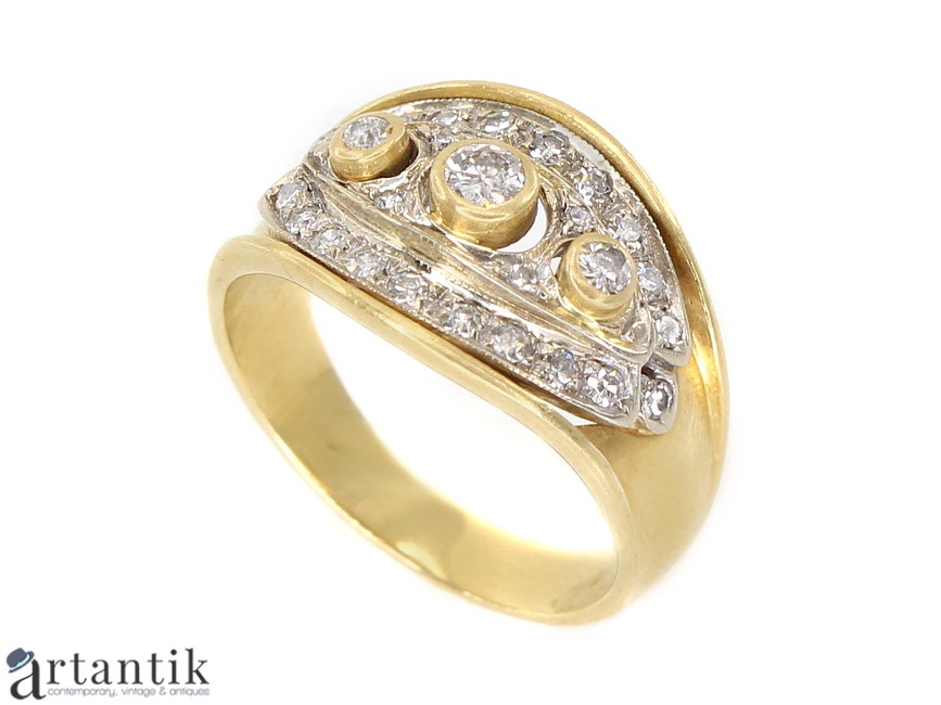 Inel vintage cu design de factură Art Deco manufacturat în aur 18 K, decorat cu o bogată suită de diamante naturale totalizând un carataj de cca. 0.38 CT