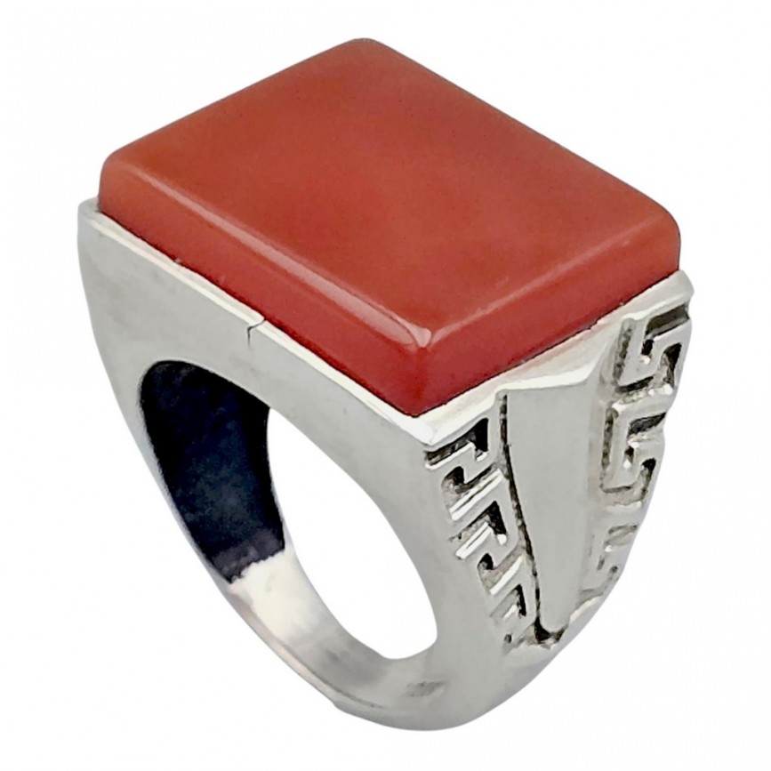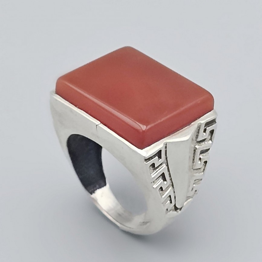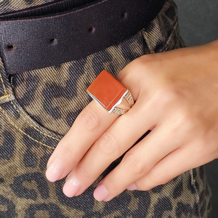 Montura masivă în argint 925, pune în centru o piatră dreptunghiulară de carneol natural,