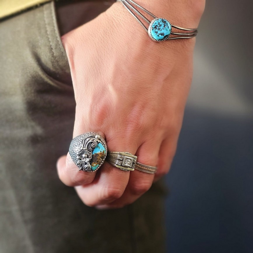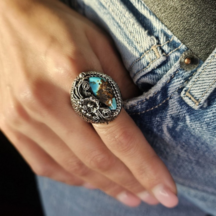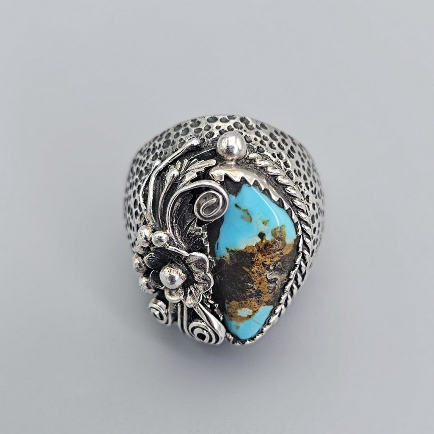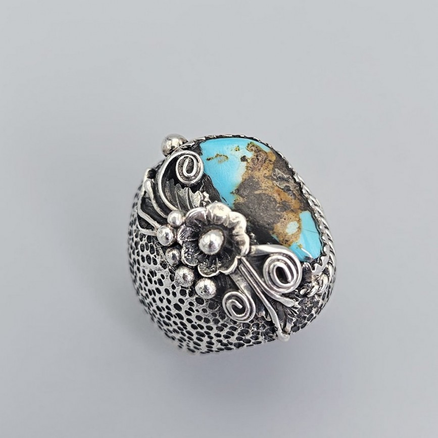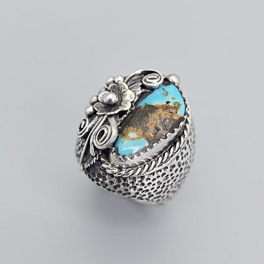Impresionant inel etnic amerindian Navajo, unisex, manufacturat în argint, decorat cu turcoaz natural Royston.
