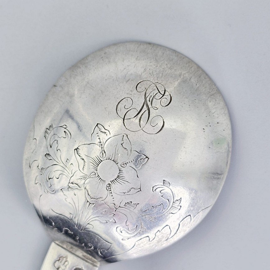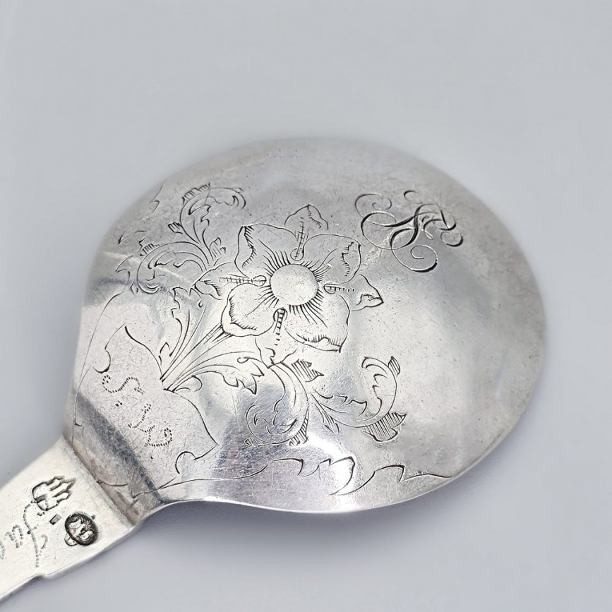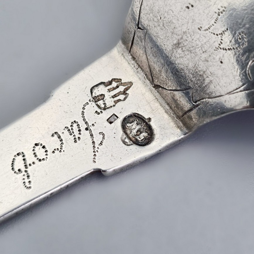 Lingură ceremonială scandinavă din argint masiv, realizată în Danemarca, la Copenhaga, datată 1744.