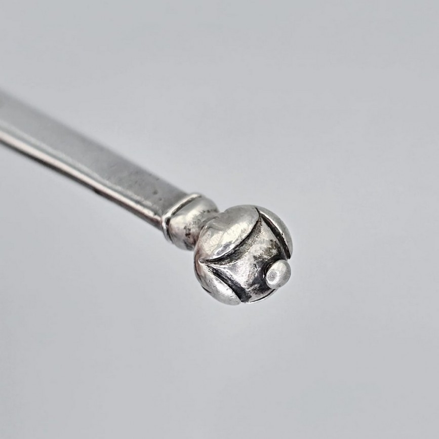 Mânerul se încheie cu o terminație bulbară redatp sculptural , de tip buton sferic segmentat, cu nervuri moi și relief discret.