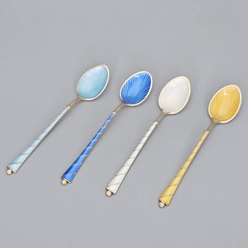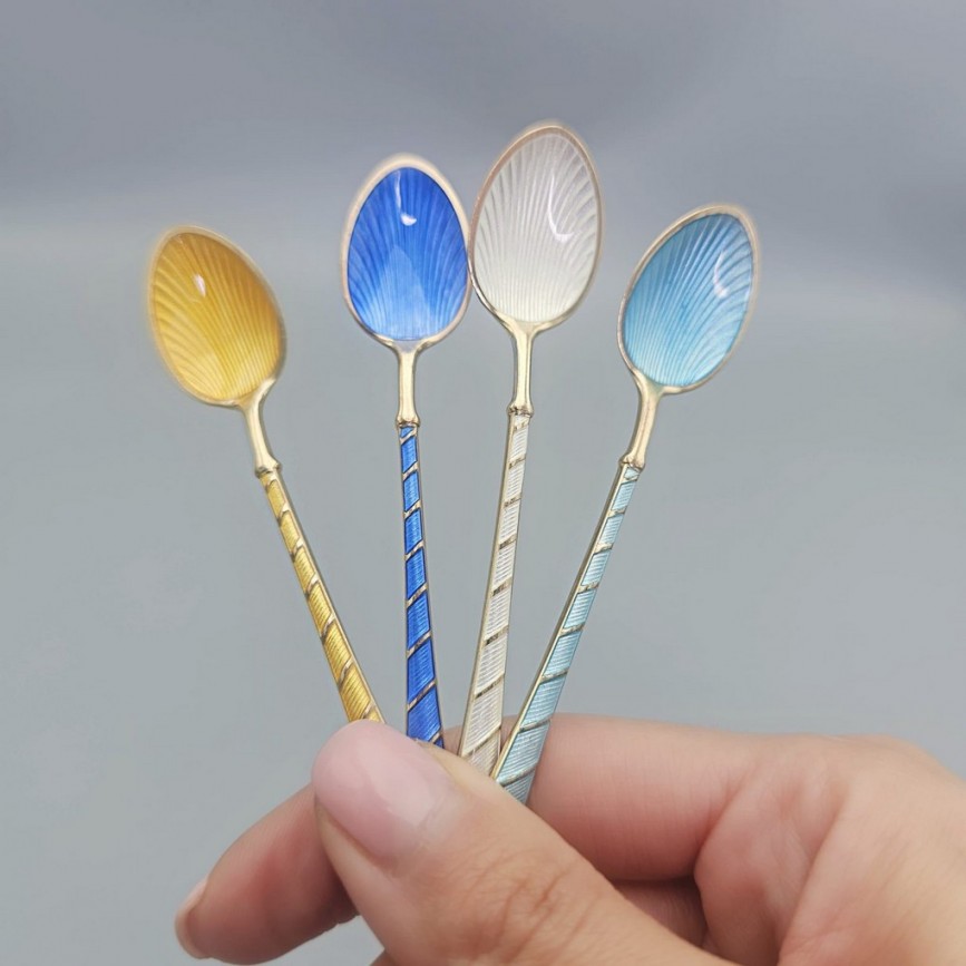 Emailul, impecabil conservat, amplifică desenul metalic și conferă fiecărei lingurițe o identitate cromatică distinctă.