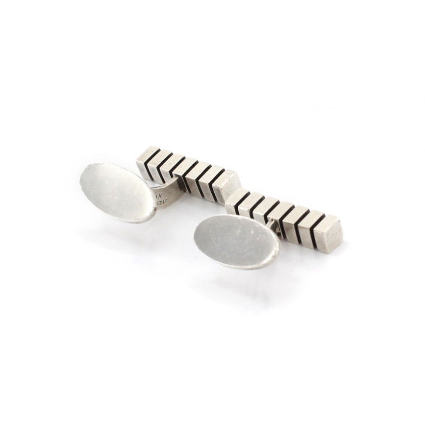 Eleganți butoni moderniști, din argint, rafinat stilizați în manieră specifică designului scandinav de perioadă mid-century.