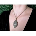 Bijuterie statement, remarcabilă atât prin dimensiunile generoase, cât și prin rafinamentul ornamentalisticii minuțios elaborate sub forma unei complexe compoziții de elemente vegetal-florale, elaborate prin filigranare în argint, dispus pe o montură robustă de aur galben.