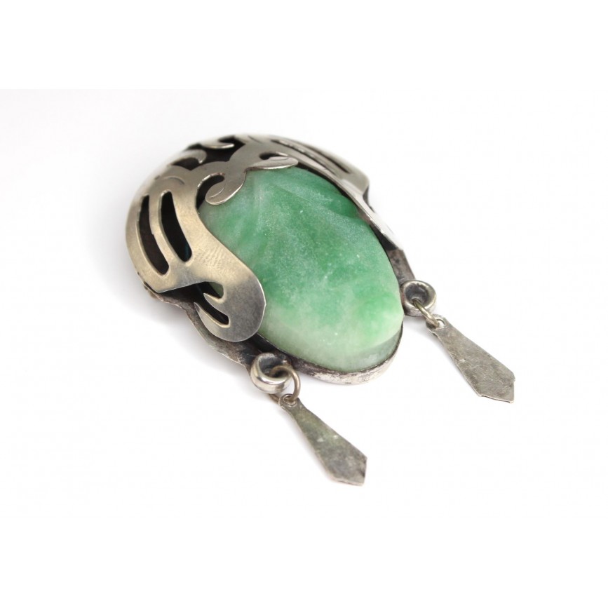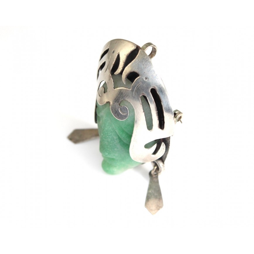 medalion elaborat sub forma unui cap de luptător aztec, sculptat în adamit verde ( mineral natural, arsenat )