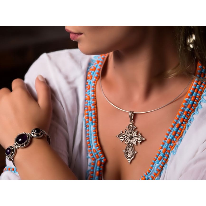 Pandant statement, minuțios elaborat sub forma unei cruci bizantine .