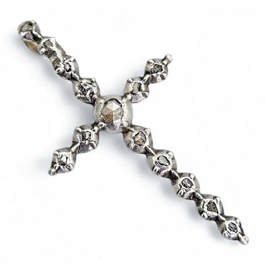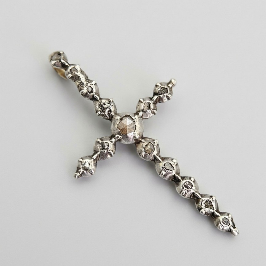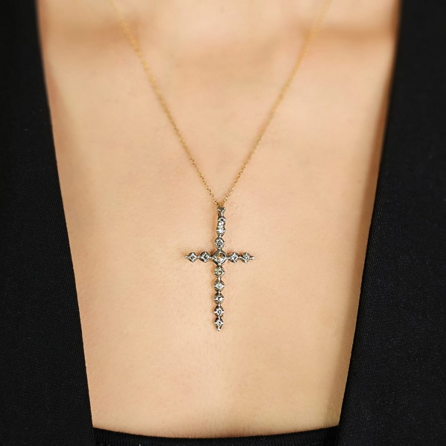 Pandant religios de epocă victoriană, stilizat sub forma unei cruci manufacturate în aur galben și argint, decorat cu diamante naturale: