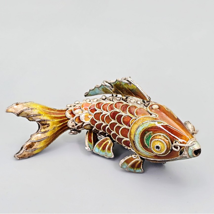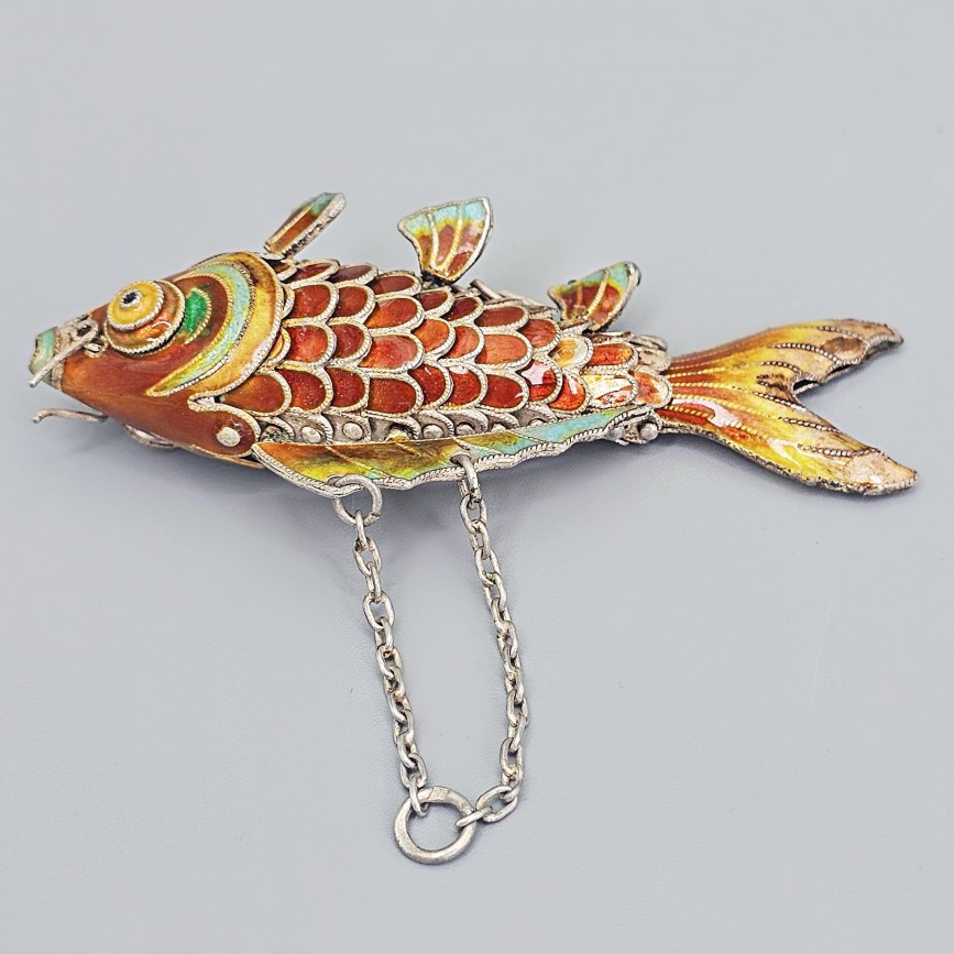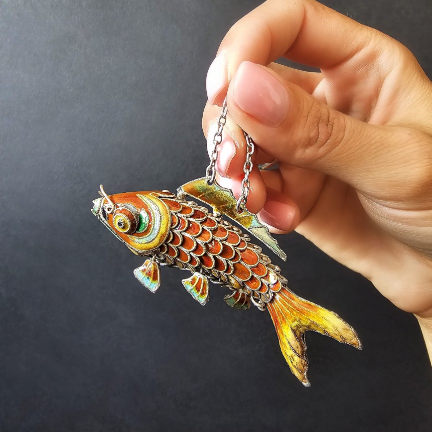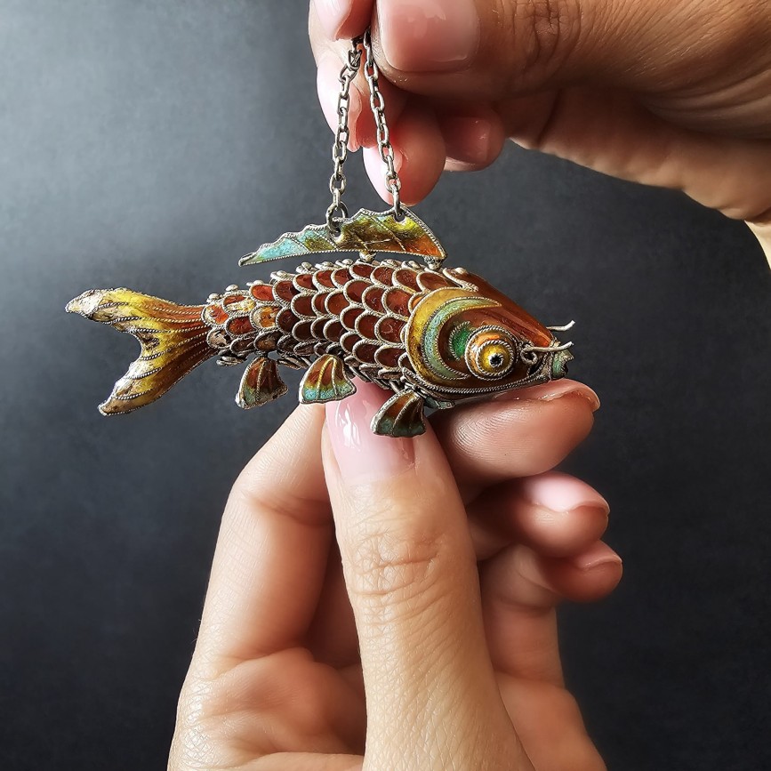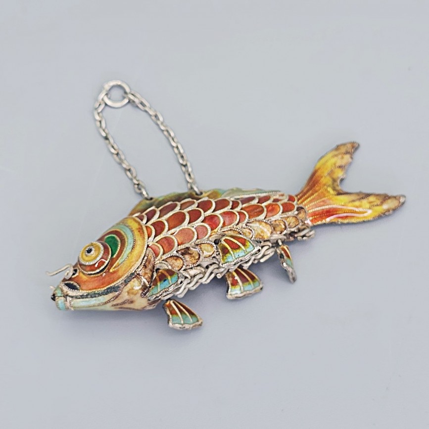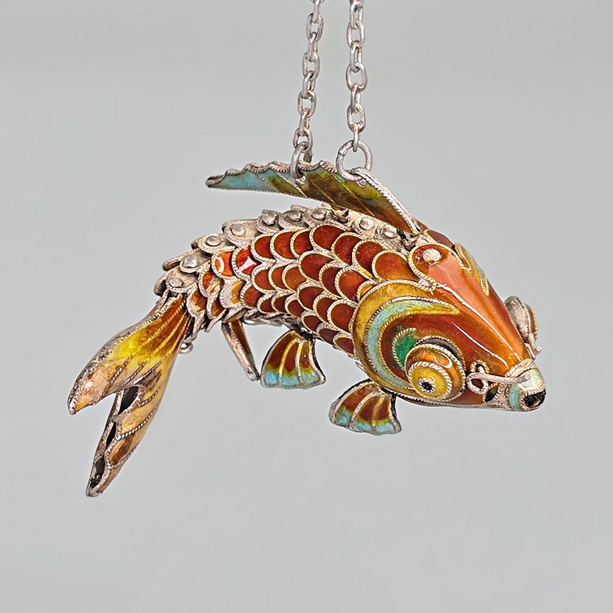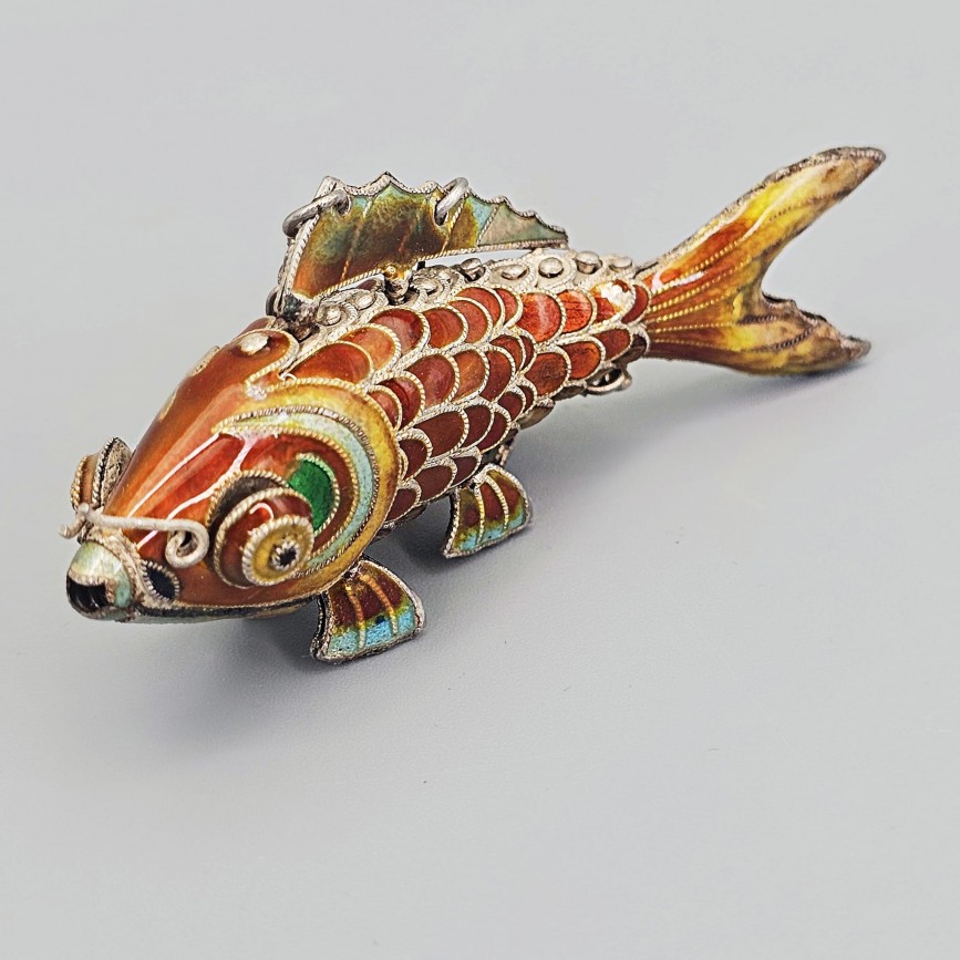 Impresionant pandant vintage chinezesc manufacturat în argint 925 sub forma unui pește koi, splendid decorat prin emailare.