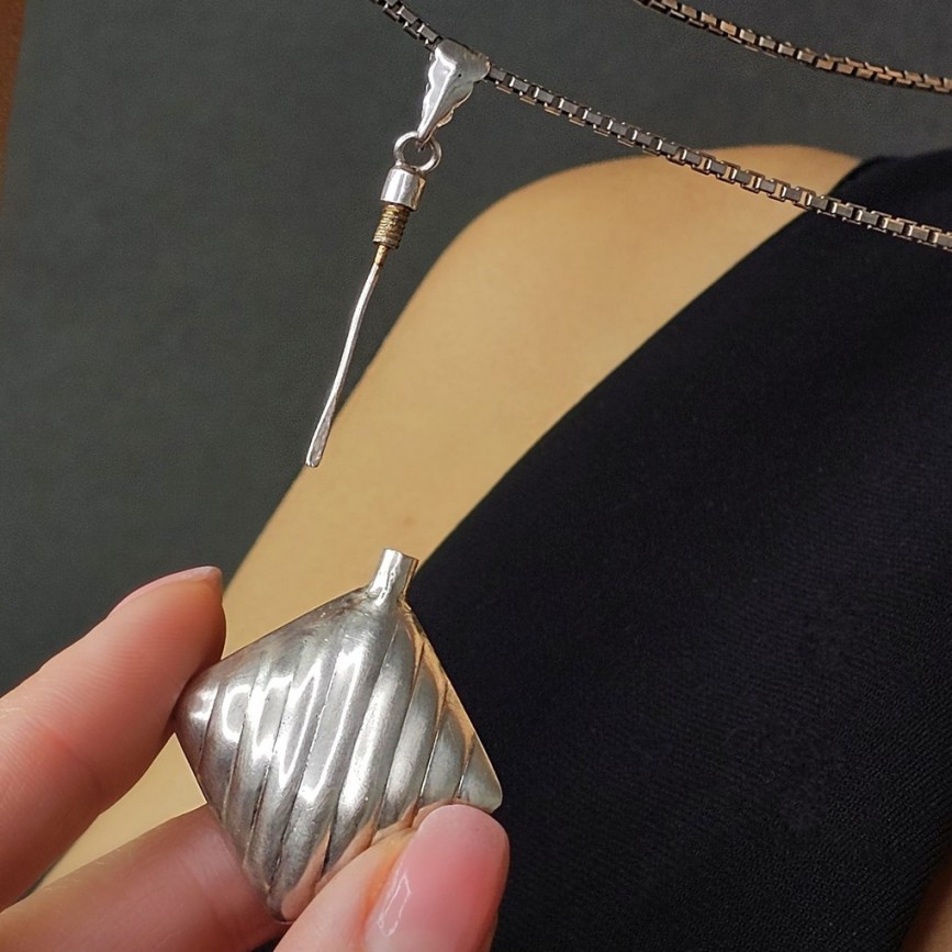 Pandantivul este un flacon funcțional pentru parfum, realizat din argint masiv,