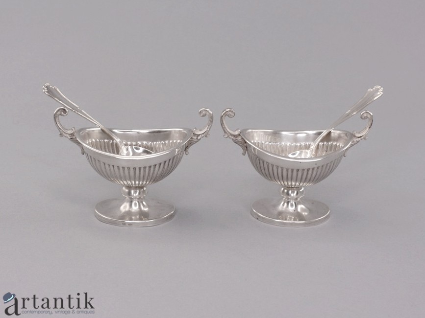 Garnitură din argint pentru servirea condimentelor, formată din două boluri și două lingurițe.