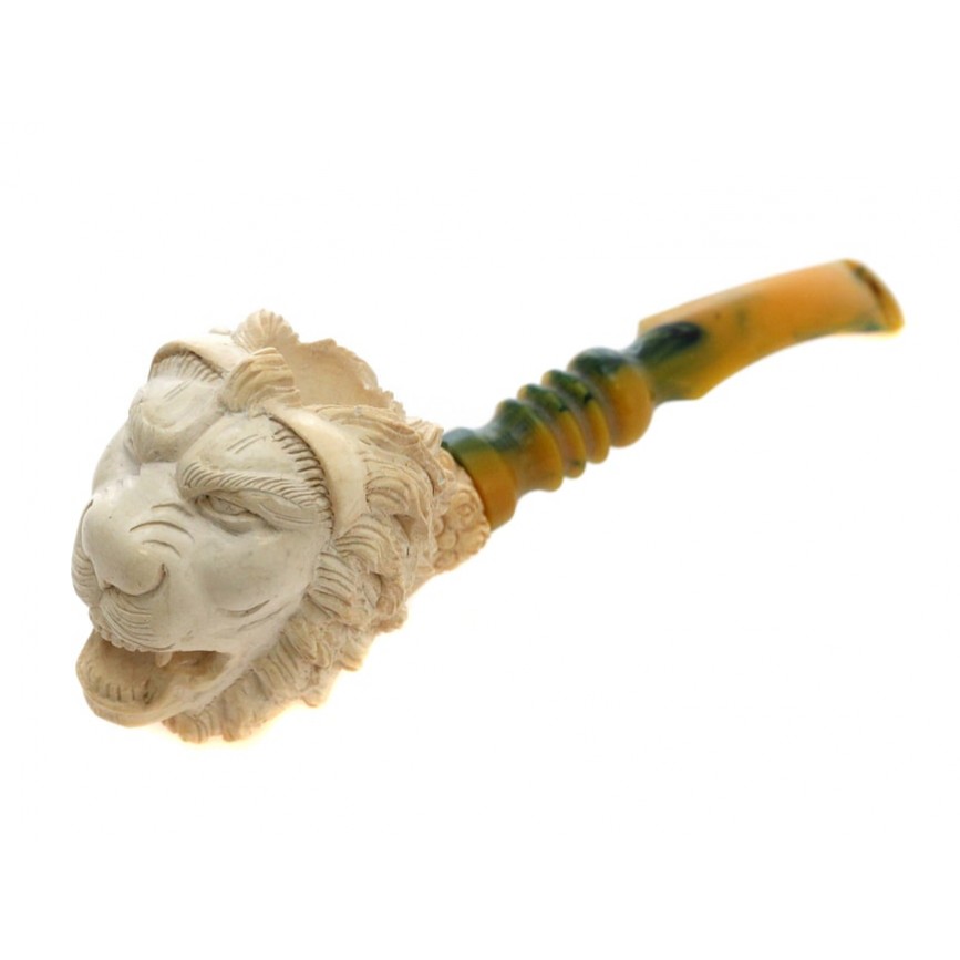 Pipă pentru fumat, splendid sculptată în spumă de mare, sub forma unui cap de leu în postură feroce.