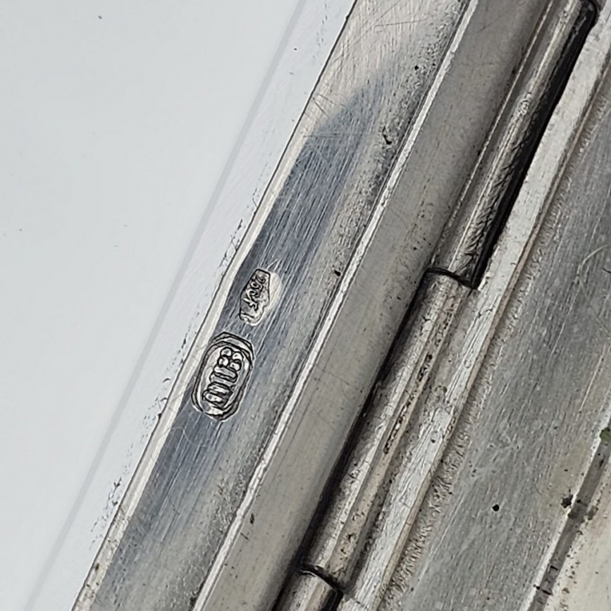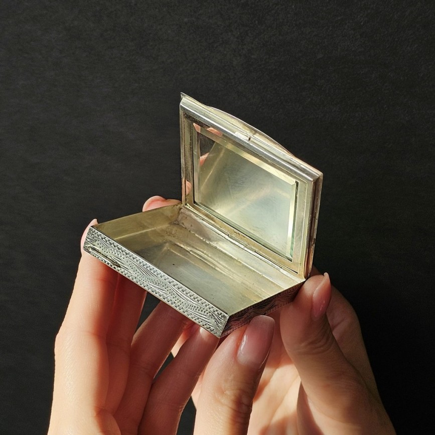 Interiorul păstrează oglinda originală din cristal bizotat, montată în ramă din argint, cu balamale solide și mecanism de închidere precis.