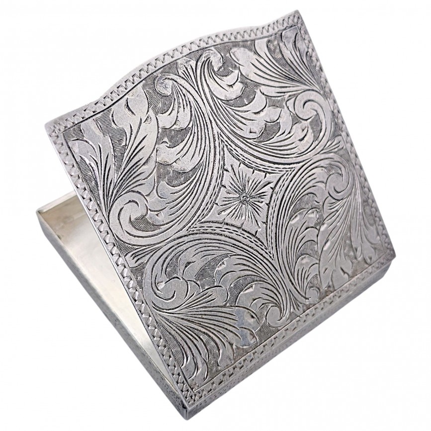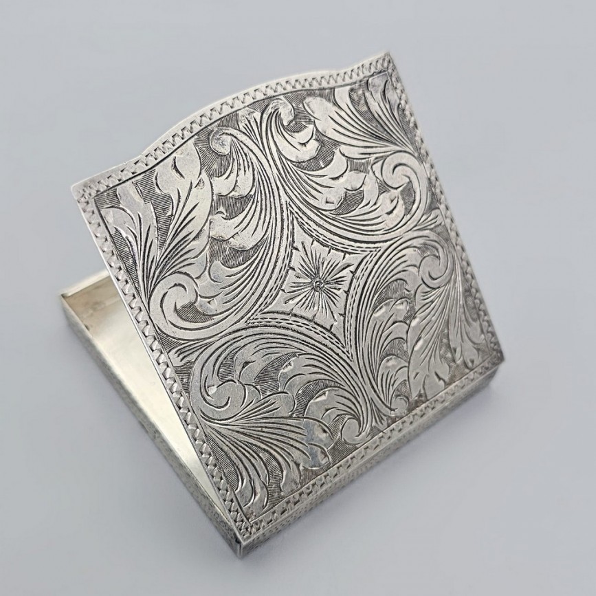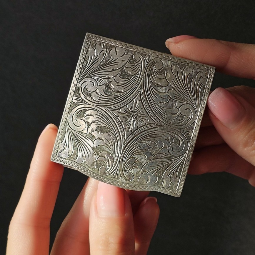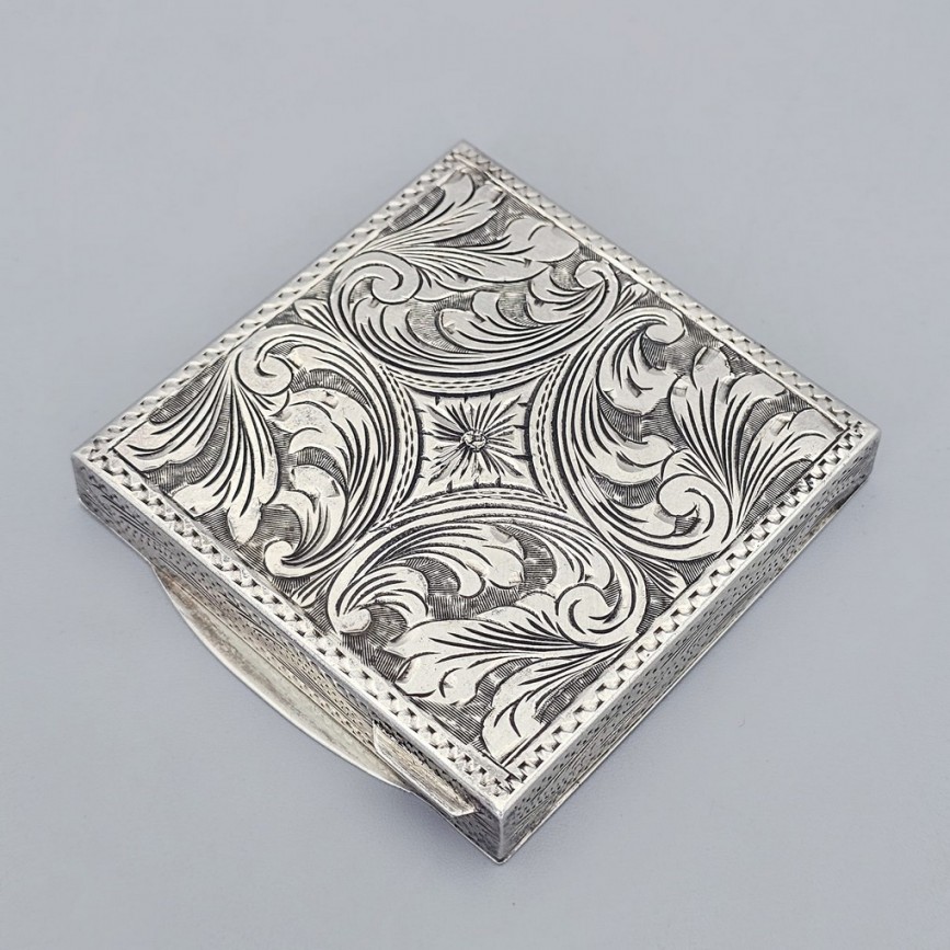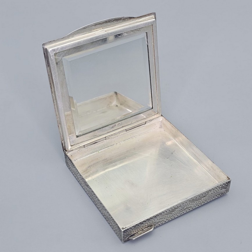 Pudrieră în manieră Art Deco din argint masiv, decorată integral prin gravare manuală.