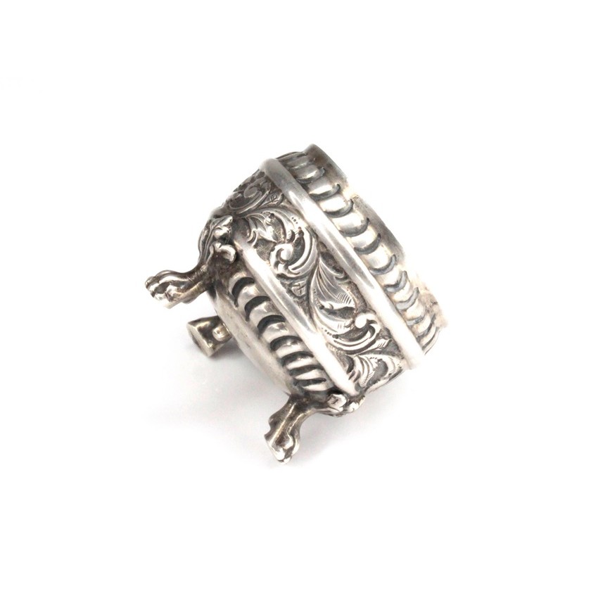Corp circular, ornamentat cu meandre de acant, cuprinse într-o bandă încadrată de frize bordurate și siluetă subliniată cu suite de godroane repoussé.