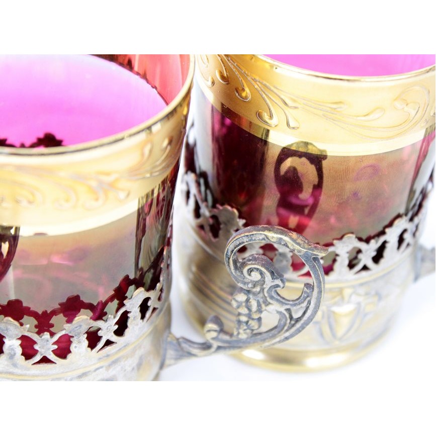 suporturi cu montură în alamă, turntă, presată, cizelată șî argintată; pahare din sticlă tip Moser: sticlă turnată în tipar, colorată în masă, tratată cu pulberi metalice iridiscente și decorată prin pictare cu aur coloidal