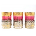 Splendide pahare, manufacturate în maniera Moser, din sticlă cu o superbă nuanță rubiniu-zmeuriu, având suprafața de expunere cu reflexii iridiscente.