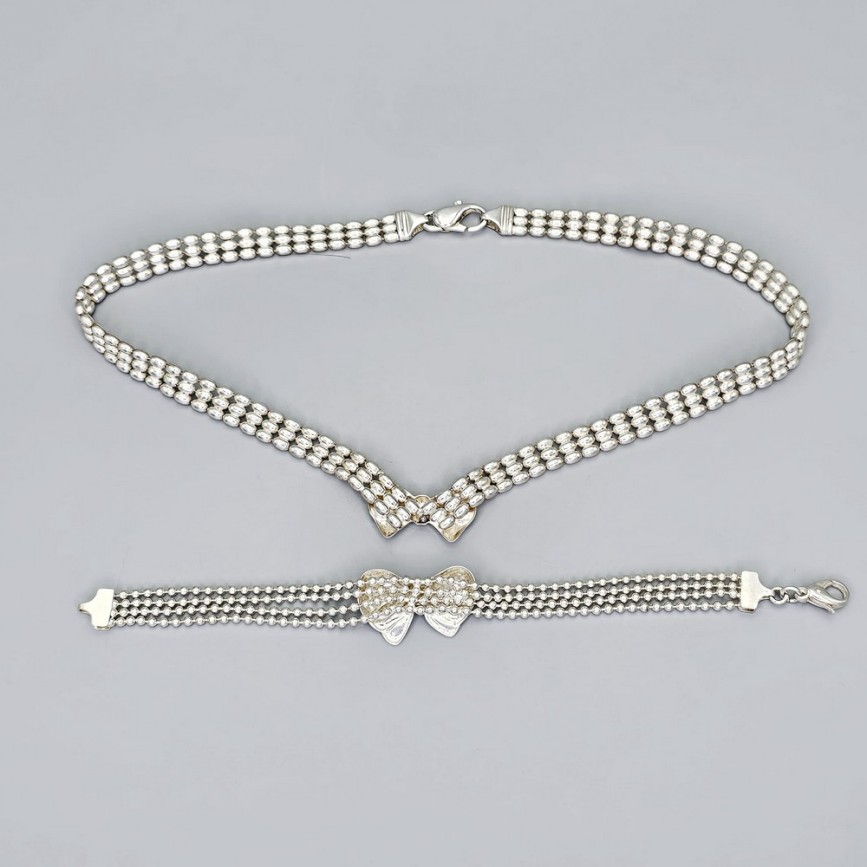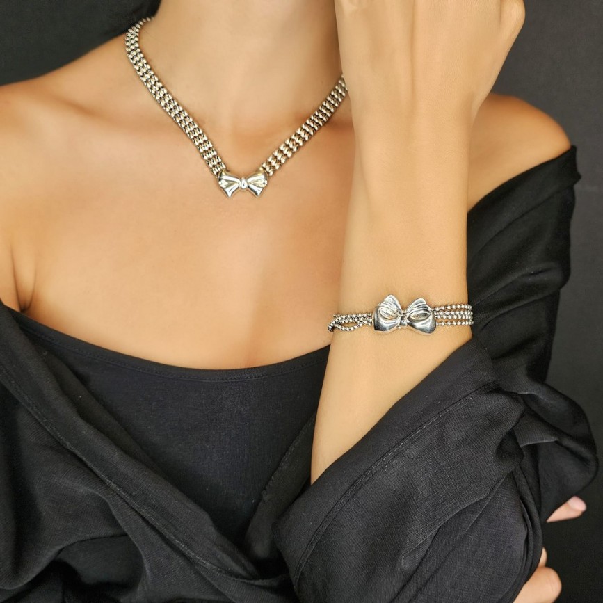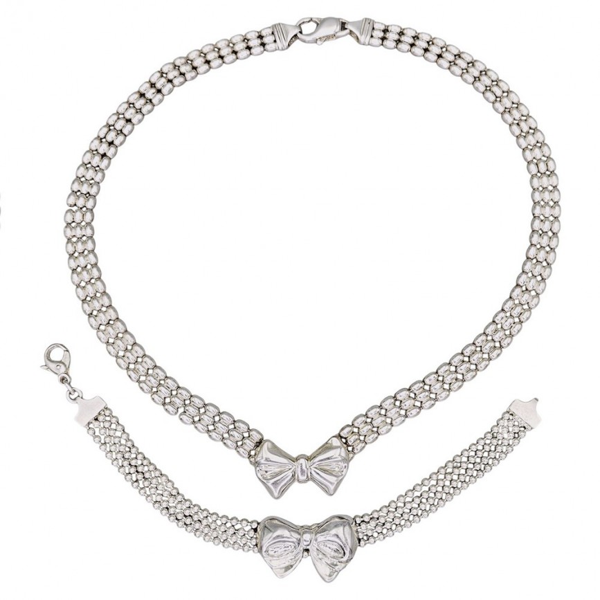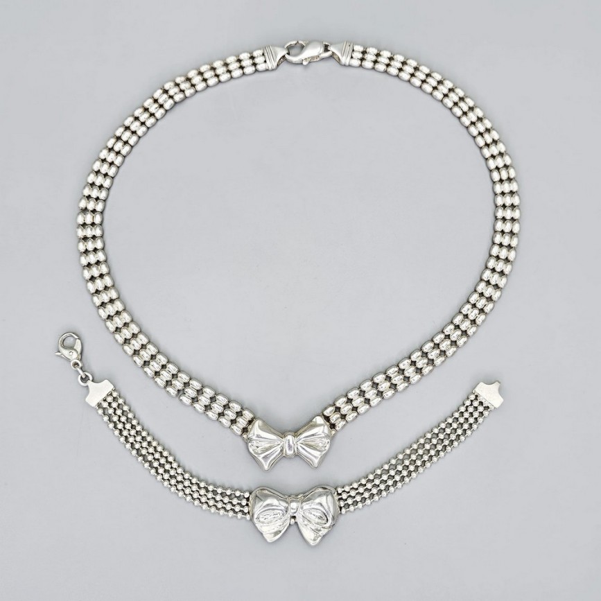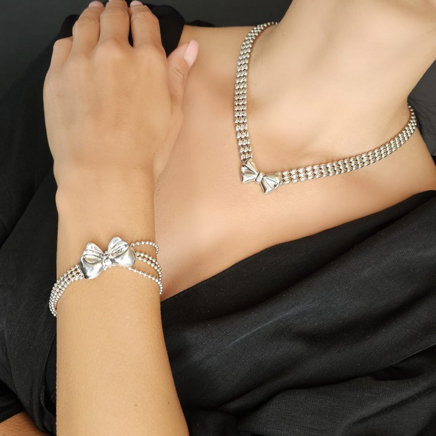 Set elegant și rafinat, alcătuit din colier și brățară realizate în argint, cu decor central în formă de fundă: simbol delicat al feminității și al grației,