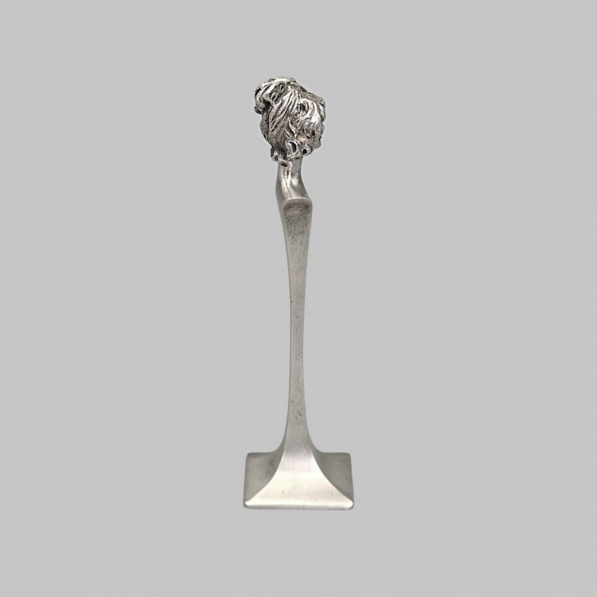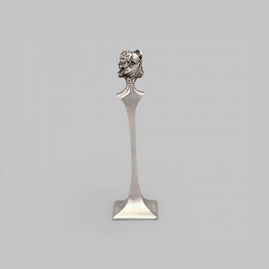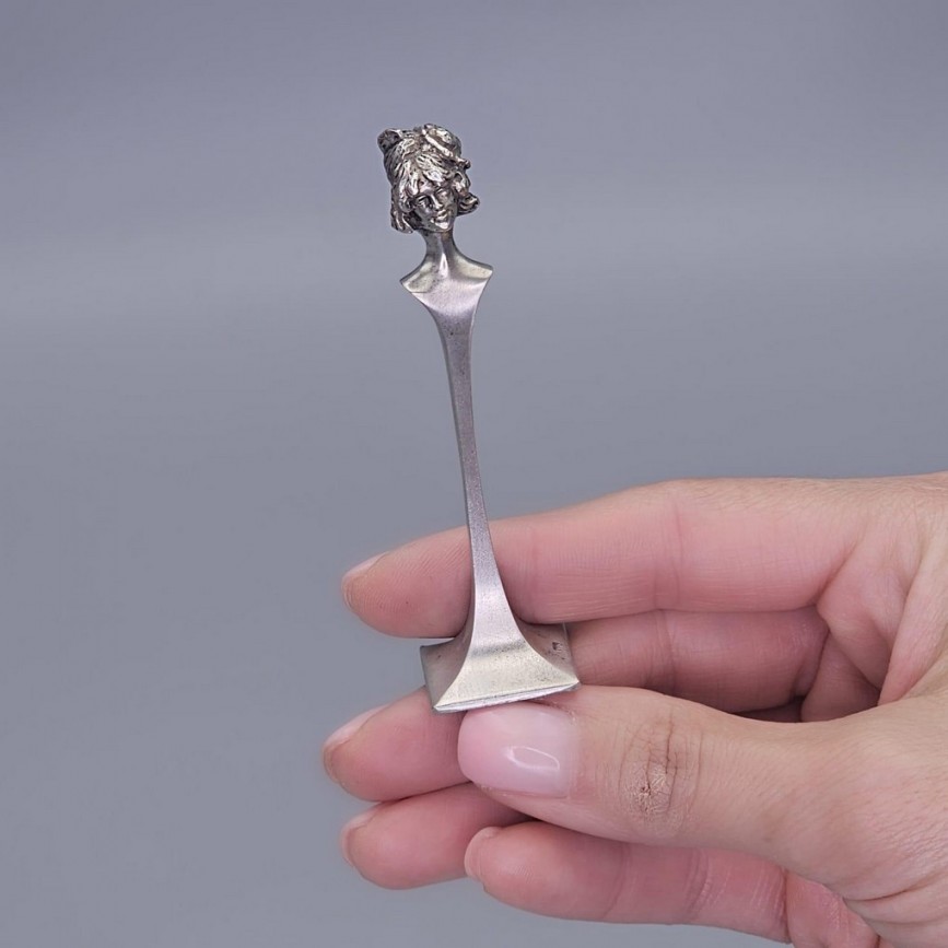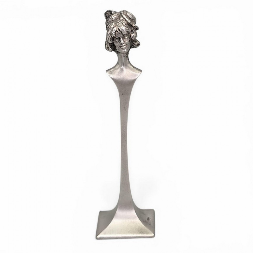 Mânerul este conceput sub forma unui bust feminin în ronde-bosse, cu trăsături delicate și coafură amplă,