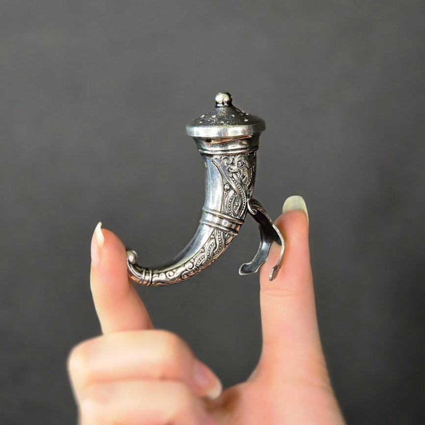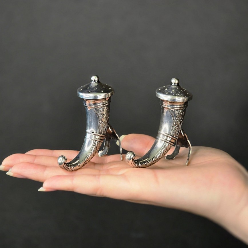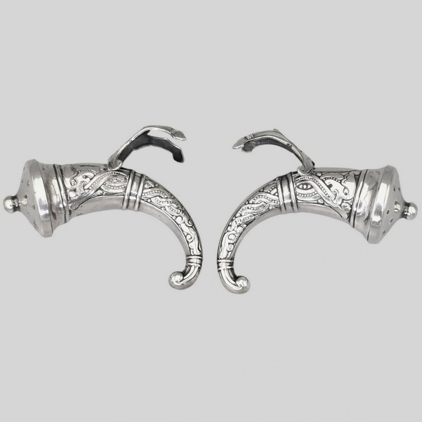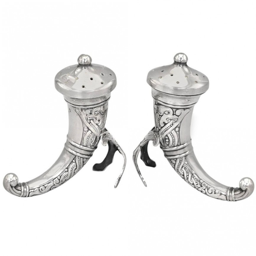 Pereche de solnițe scandinave din argint stilizate sub forma unor cornuri vikinge