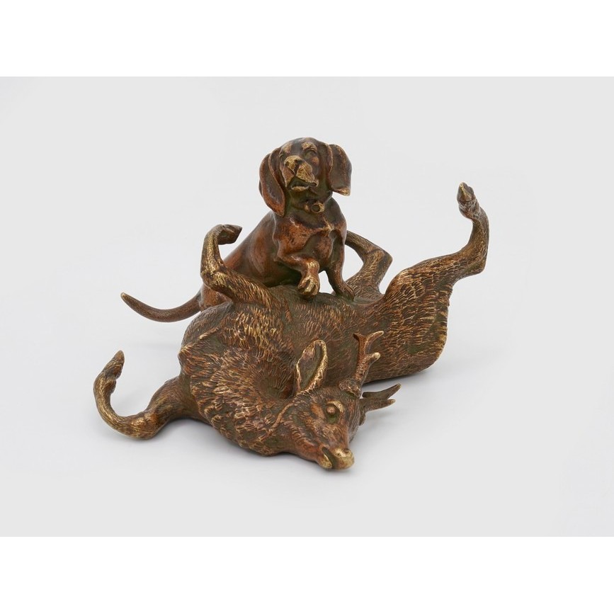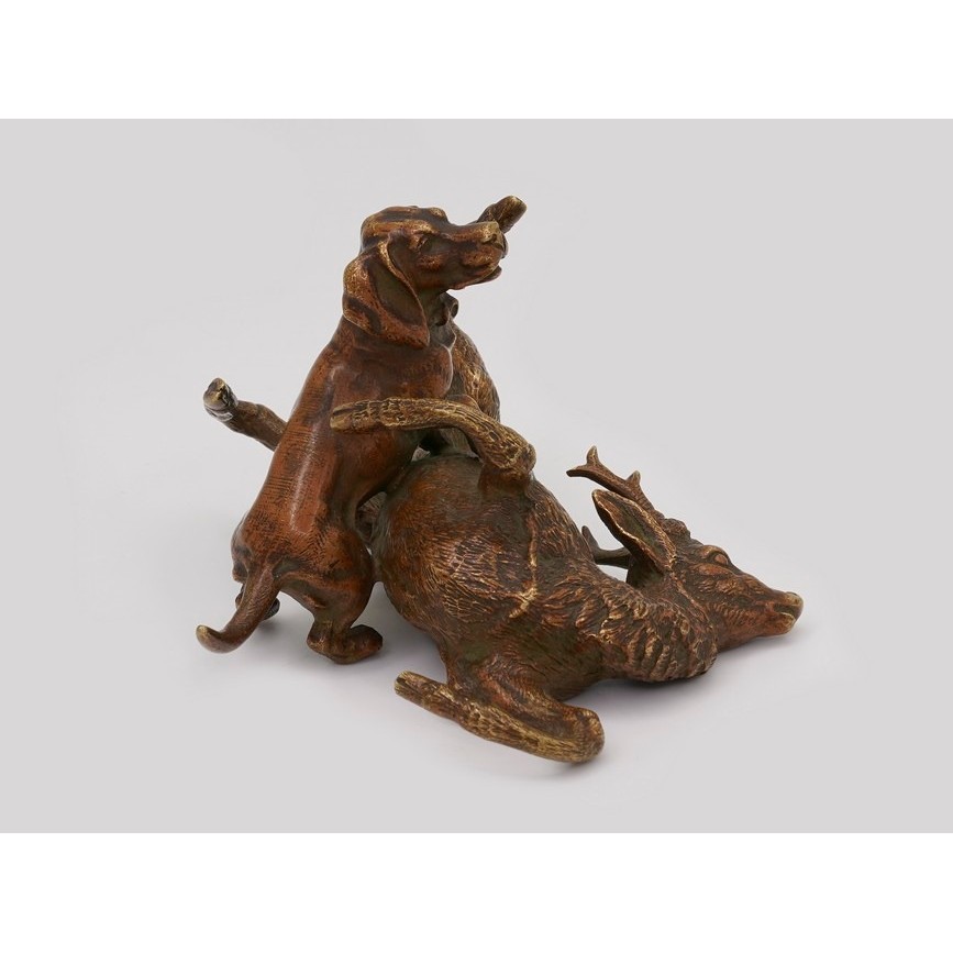 Compoziție ronde-bosse, redând cu o deosebită acuratețe și expresivitate artistică, un cerb hăituit de un câine de vânătoare.