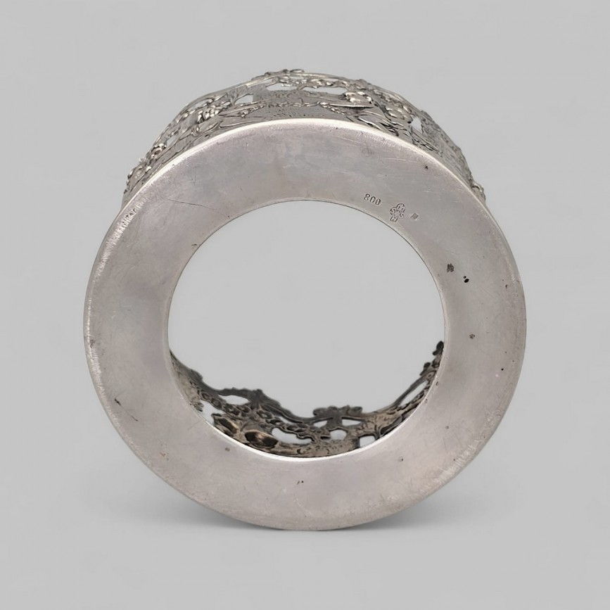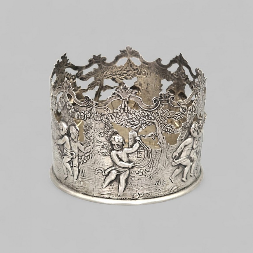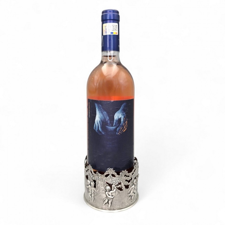 Elegant suport pentru sticlă de vin, realizat din argint decorat în tehnica au repoussé și cizelare,