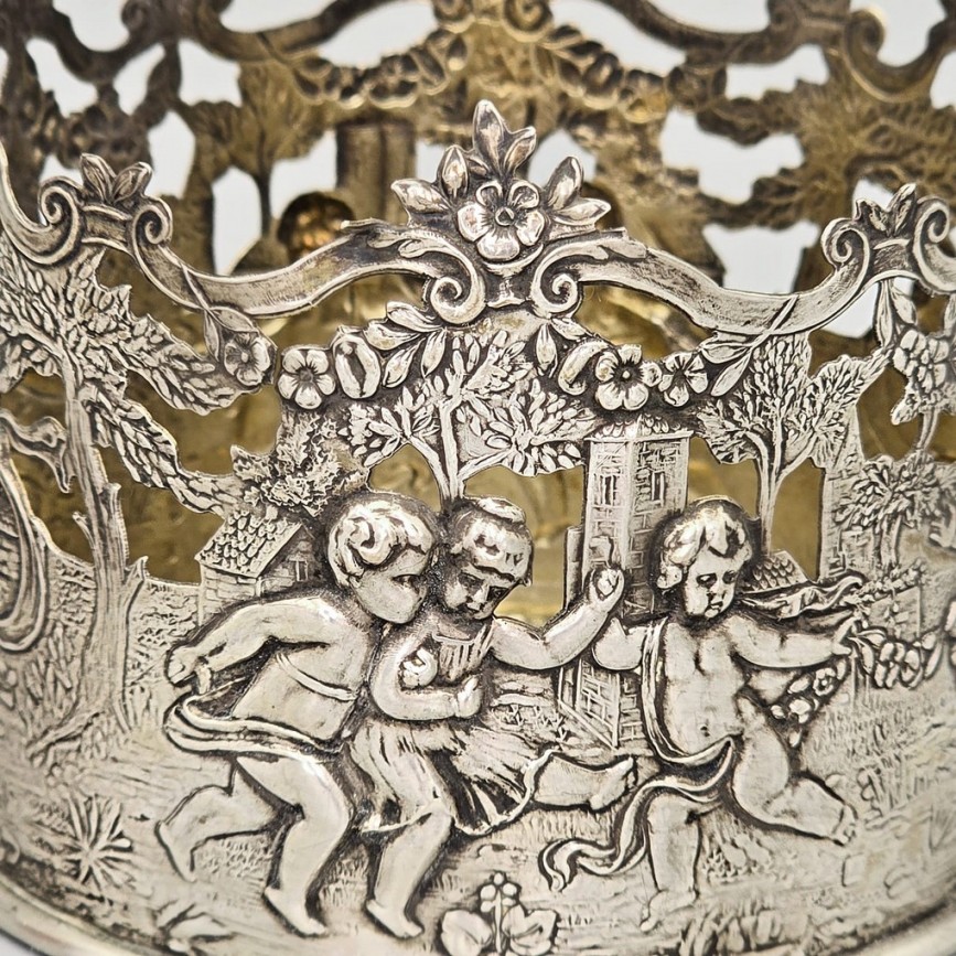 Corp ajurat și animat de o scenă continuă cu putti în peisaj pastoral, acompaniați de motive vegetale fluide și volute rocaille,