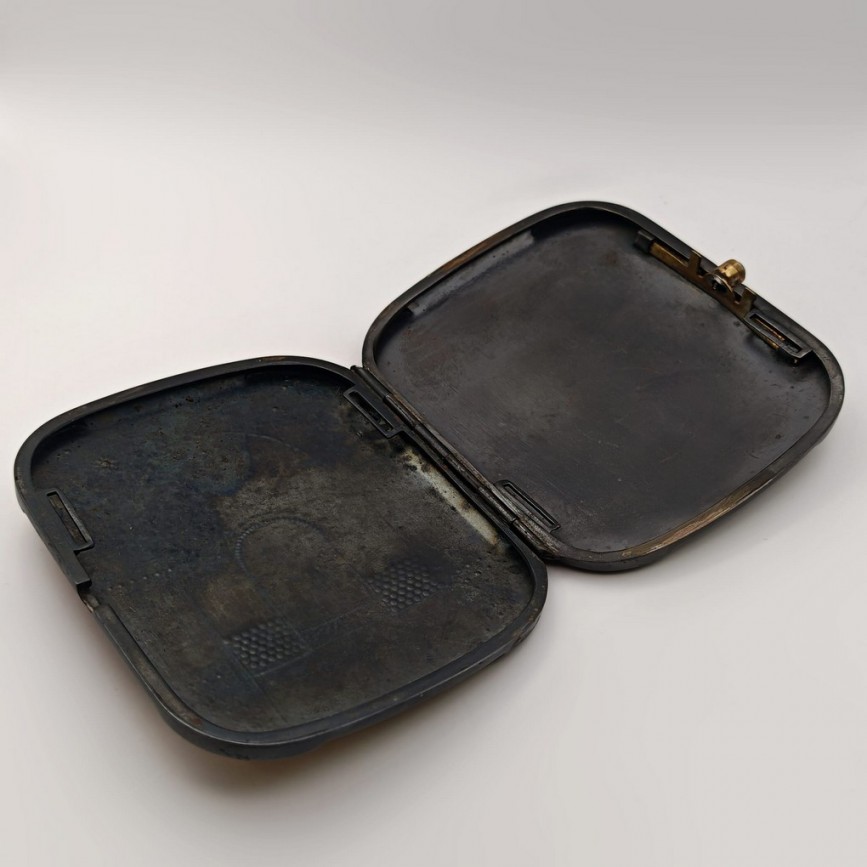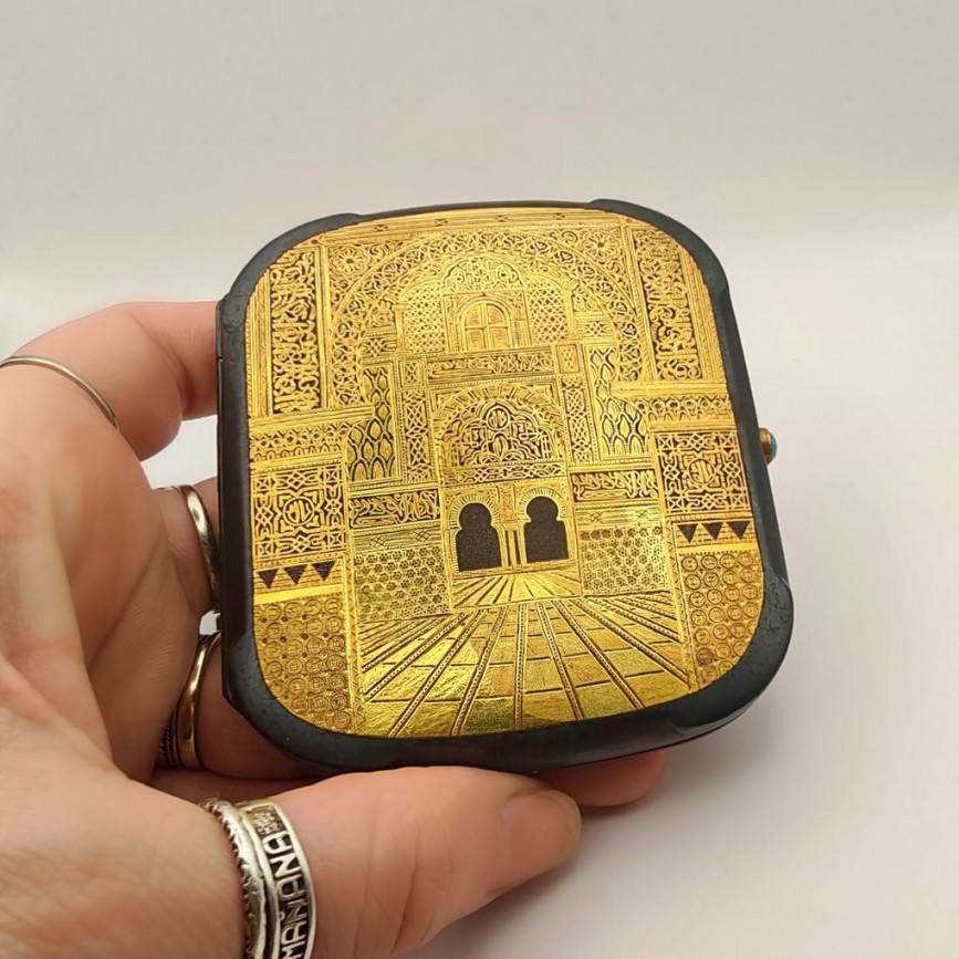 NOU Tabacheră de perioadă Art Deco decorată prin incrustare cu aur 24k | damasquinado de oro | atelier Toledo - Spania cca. 1930