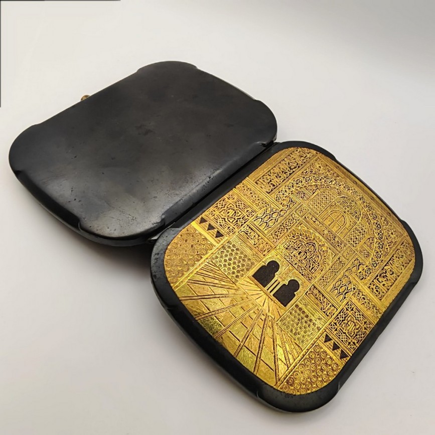 Tabacheră de epocă realizată în atelierele din Toledo, decorată în tehnica tradițională damasquinado de oro,