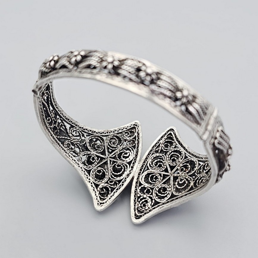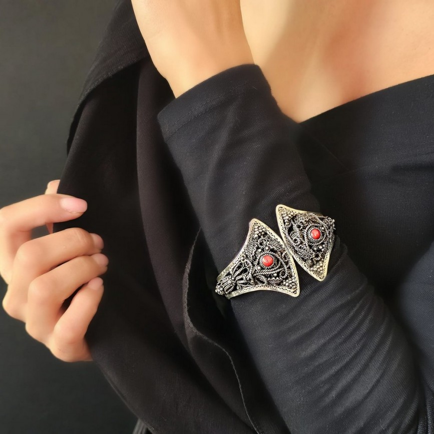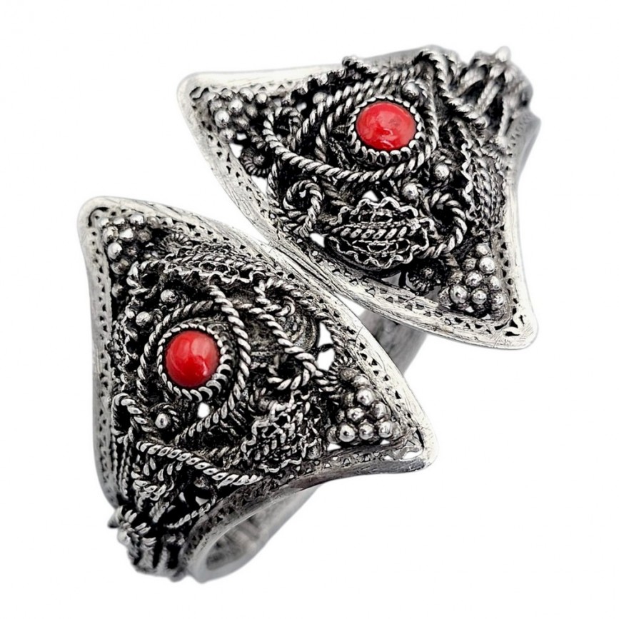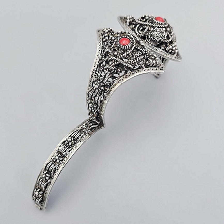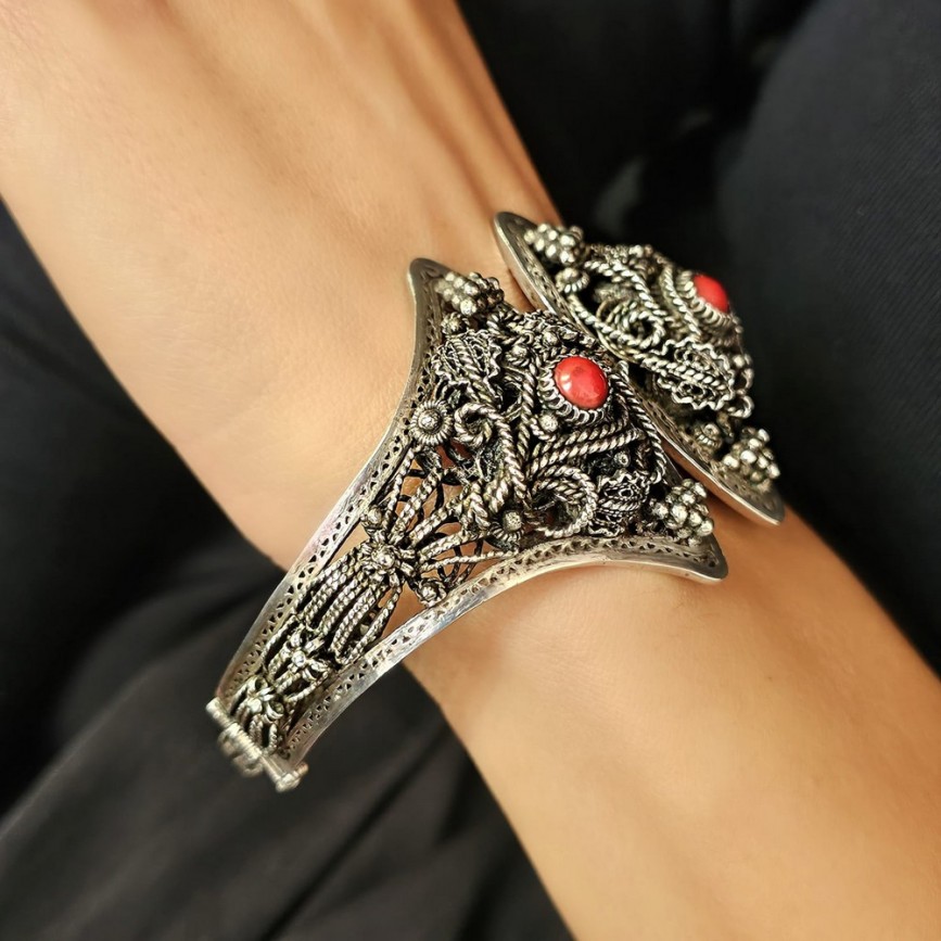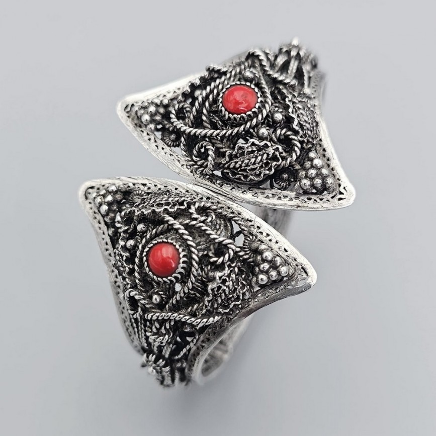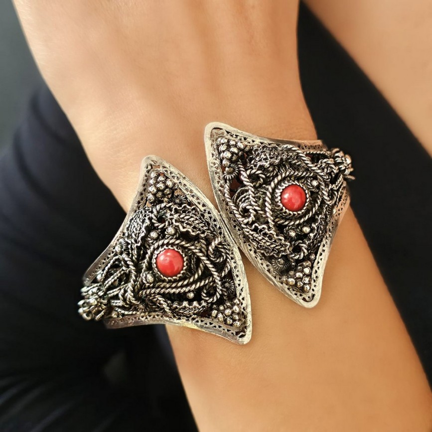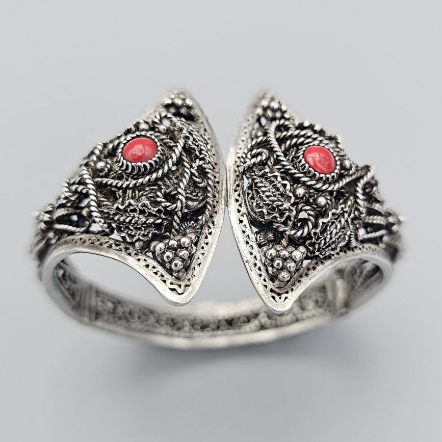Veche brățară etnică balcanică albanezo - kosovară manufacturată în argint filigranat, decorată cu anturaje de coral.