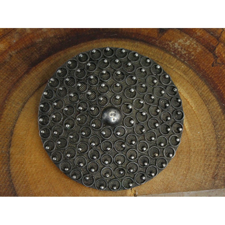 Veche broșă scandinavă rafnat ornamentată în manieră specifică podoabelor antice vikinge descoperite în situl arheologic Birk din Suedia.