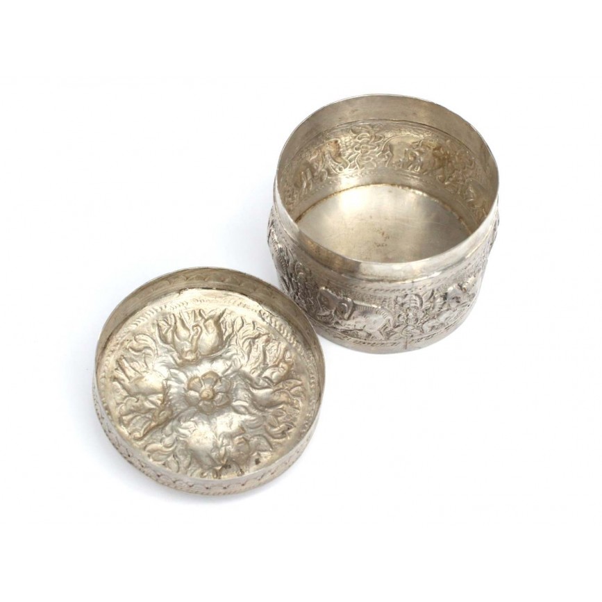 recipient prevăzut cu un capac detașabil prin tragere, abundent decorat cu motive floral-vegetale și elefanți dispuși în cerc ( simbol clasic al universului, al ciclicității, al renașterii și perfecțiunii )