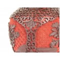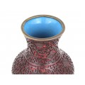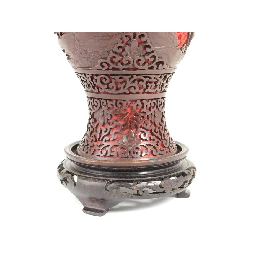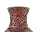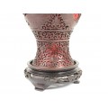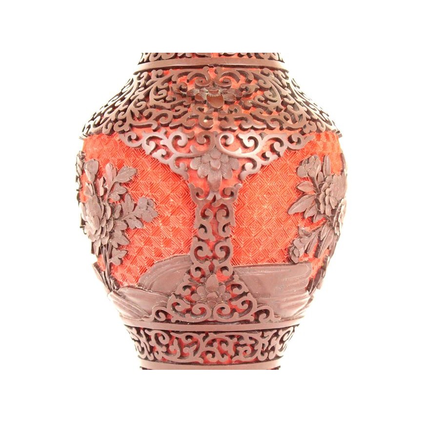 Splendidă vază chinezească, realizată din alamă îmbracată în lavuri de cinabru roșu și cinabru brun, sculptat prin tehnica Qīdiāo (chineza: 漆雕).