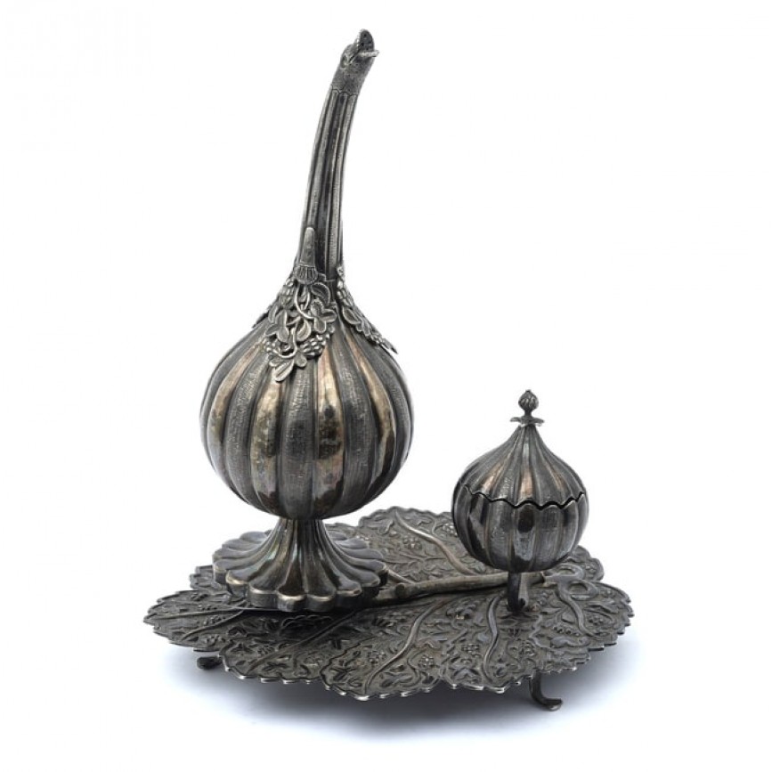 Garnitura este formată din 3 piese: recipient-aspersoriu pentru apă de trandafiri, bol pentru păstrarea mirodeniilor (besamim), suport