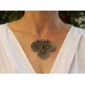 Impozantă amuletă pectorală turkmenă, elaborată sub forma unei podoabe Asyk, specifice mireselor din triburile Teke și Yomut.