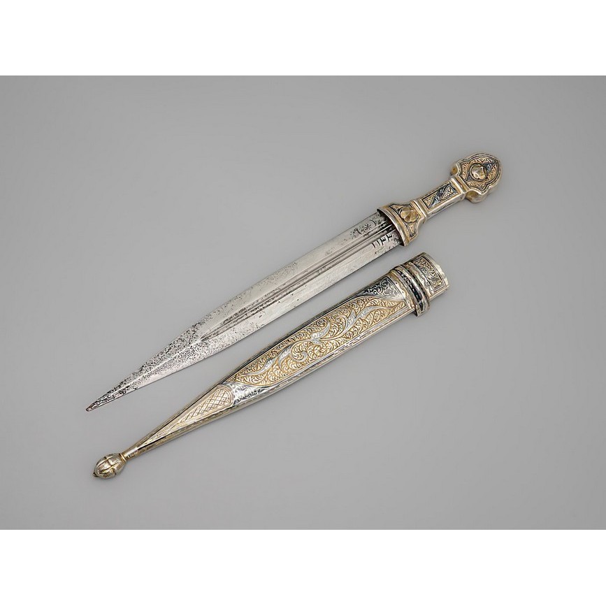 Mâner și teacă din argint înnobilat cu accente cromatice realizate prin patinare niello și suflare cu aur galben.