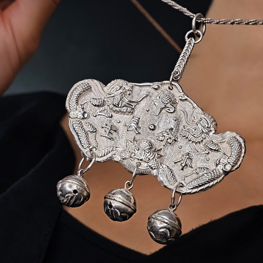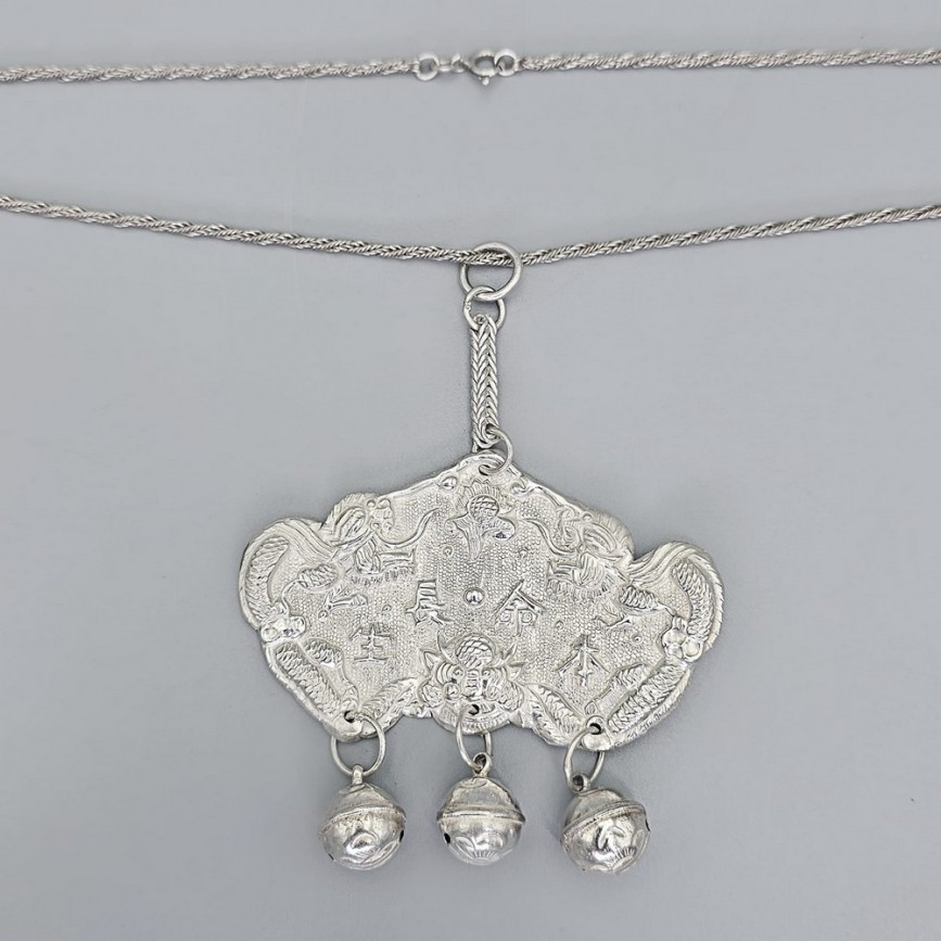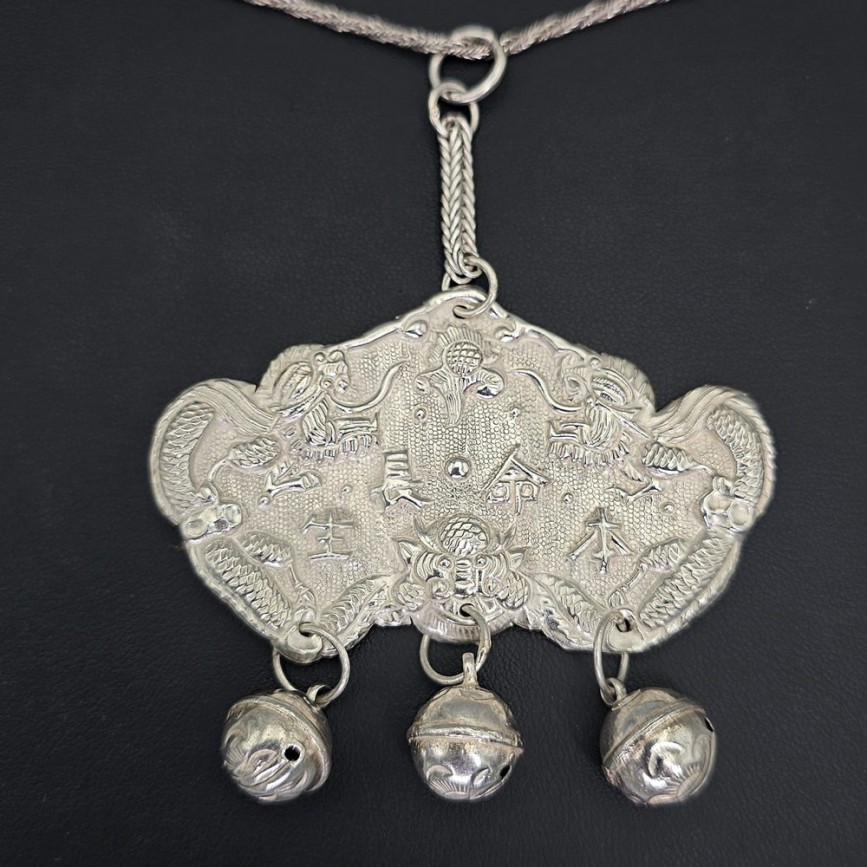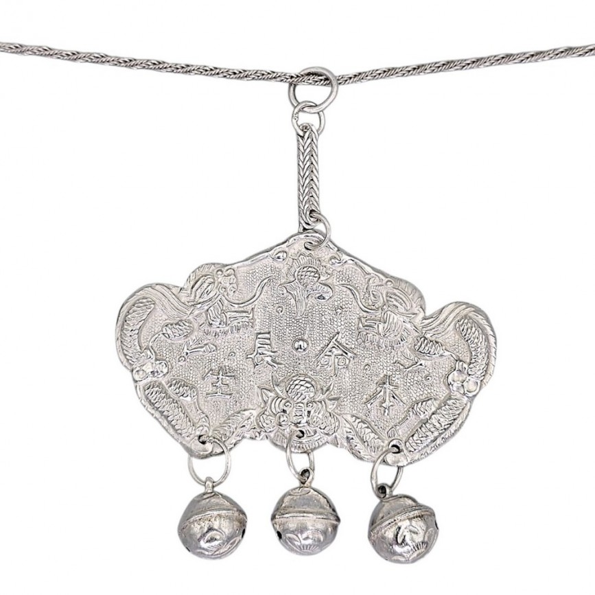 Colier din argint accesorizat cu o veche amuletă chinezescă Longevity Lock sfârșitul dinastiei Qing cca. 1880 – 1910.