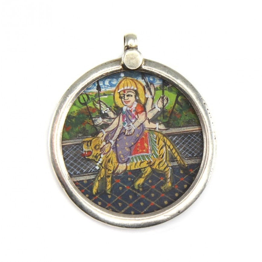 Veche amuletă hindusă accesorizată cu o pictură ilustrând-o pe zeița Durga.