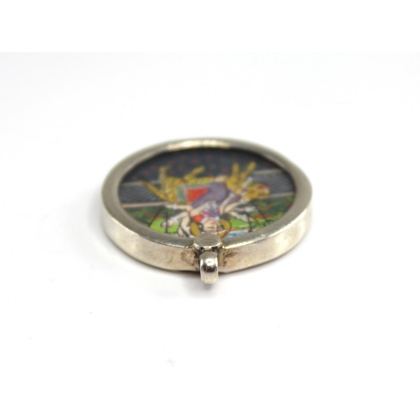 manufactură în argint turnat, presat și cizelat; pictură manuală, lentilă din sticlă